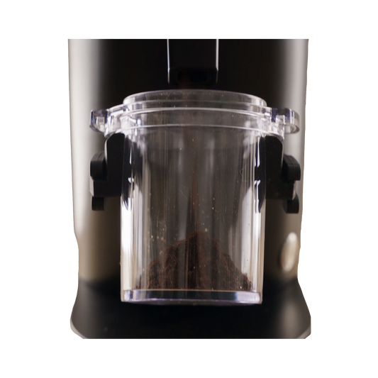 The DF54's construction is truly premium. Thanks to the choice of sturdy materials, the grinder weighs almost 5 kilos, which means it sits securely on your countertop. A unique feature of the DF54 is the ionizer outlet, which minimizes static electricity while grinding coffee, keeping coffee particles from flying away. The transparent dosing cup makes it easy to see how you're measuring the coffee into your filter holder, a real advantage in our opinion.
