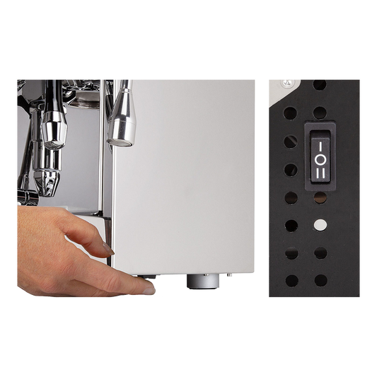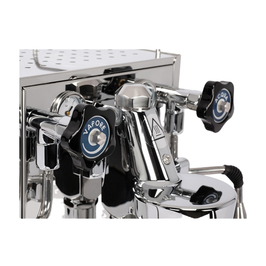 The vibration pump quietly pushes water through the coffee bed. The PID shot timer shows you how long the extraction lasts. You can set the water temperature with the PID switch. The cold touch steam wand produces soft milk foam once the boiler is heated, and the hot water wand makes it easy to prepare an Americano or tea. With this model you can brew coffee and froth milk at the same time.