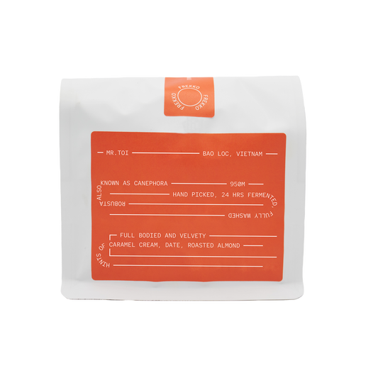 Top-quality Canephoras are Toi Nguyen's trademark. Mr. Toi is the first Vietnamese farmer to produce specialty Canephoras. What makes this coffee so special is a natural mutation that causes each coffee cherry to produce only a single seed. But that's not all: thanks to a unique process, these beans have achieved a quality worthy of competition. They are fermented for at least 70 hours in stainless steel tanks, resulting in a wine-like and velvety flavor profile. You'd almost think Canephora couldn't taste good.