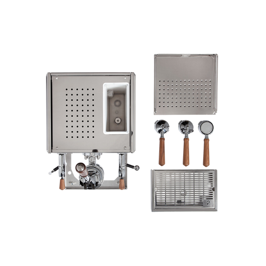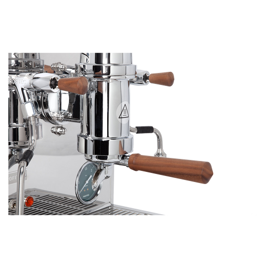 At 36 kg, the PRO 800 II is a literal heavyweight in the coffee world, thanks to a concrete block incorporated into the machine to counterbalance the siphon. The exterior is elegantly finished with American walnut, stainless steel, and a pine green pressure gauge. The PID allows you to easily adjust the boiler pressure and steam power. As an added bonus, it comes standard with three filter holders, a tamper, and filter baskets.