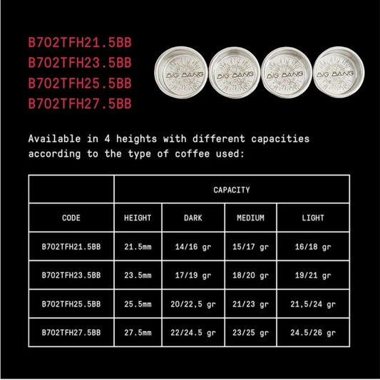 De IMS Big Bang filterbaskets zijn beschikbaar in vier verschillende hoogtes, elk met een eigen capaciteit afhankelijk van het type branding dat je gebruikt. Zo kun je altijd het perfecte bakje kiezen voor jouw espresso, of je nu werkt met een lichte, medium of donkere roast.