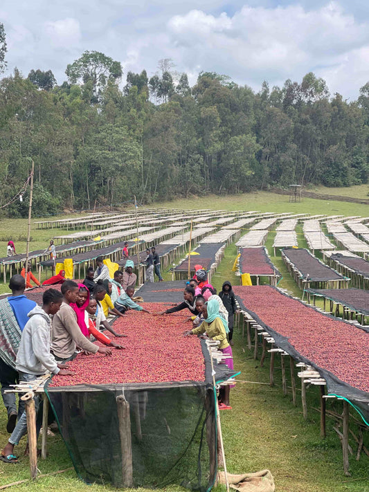 Deze koffie is verbouwd op de Daye Bensa-boerderij door de familie Dukamo. Zij combineren innovatie met traditie en ze staan bekend om hun uitzonderlijke microlots. Deze koffie is verwerkt als Natural Tellabet, dat betekent dat de koffiebessen een anaerobe fermatie met teff zijn ondergaan. Teff is een Ethiopisch graan dat vaak wordt gebruikt als starter voor zuurdesem. De teff maakt het fermentatieproces nog sterker en geeft de uiteindelijke koffie gelaagde smaken.