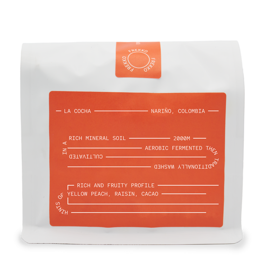 Deze koffie komt van de producent La Cocha in Nariño, Colombia. Opgericht om koffie met betekenis te maken. Dit doen ze door met lokale boeren een community te onderhouden waar ontmoeting centraal staat en er ruimte is om van elkaar te leren en samen te experimenteren.