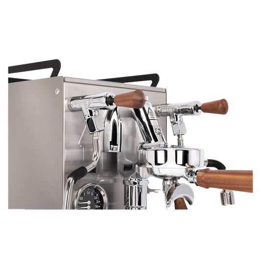 Qua bouw zit het ook goed: de Profitec JUMP is een unieke combinatie tussen verschillende materialen, verschillende afwerkingen van RVS, een modern zwart frame en accenten van Amerikaans walnoothout. Extra fijn: je krijgt er standaard 2 filterdragers met houten hendel en een Profitec tamper bij.