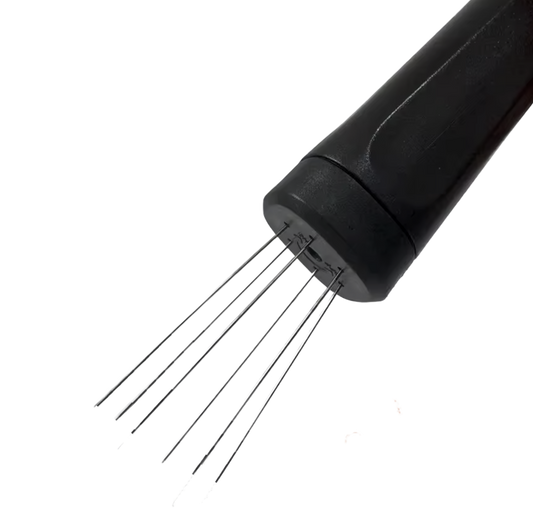 Bij espresso draait alles om consistentie. Zit je koffiebed vol klontjes, dan kiest water zijn eigen weg en dat proef je meteen terug in een zuur of bitter shot. Met de WDT pen roer je het maalsel los en gelijkmatig, zodat het water netjes door het hele koffiebed kan lopen.