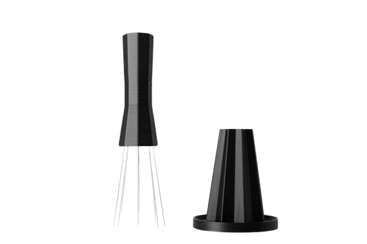 Je kunt de tool bij ons kopen met of zonder houder. Met houder staat die netjes op je werkblad en mors je minder. De tool is 3D-geprint, licht in de hand en perfect om je koffie gelijkmatig te verdelen met de 0,3mm naalden.